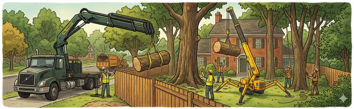 Our crew evaluates every job before recommending crane removal. If the tree can come down safely with conventional methods, we will say so — we do not bring a crane unless the job genuinely calls for one.