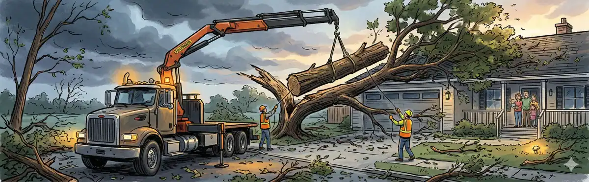 Crane-assisted removal is faster, safer, and causes less property damage than conventional methods for large trees. Instead of dropping pieces one at a time through the canopy — risking damage to everything below — the crane lifts entire sections straight up and sets them down where we want them. A job that might take two days of climbing can often be completed in a few hours with a crane.